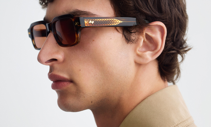 The distinctive lntrecciato wirecore continues to evolve across timeless acetate styles. Decorative studs, mechanically screwed hinges, and lasered detailing reveal a considered, inside-out approach to construction