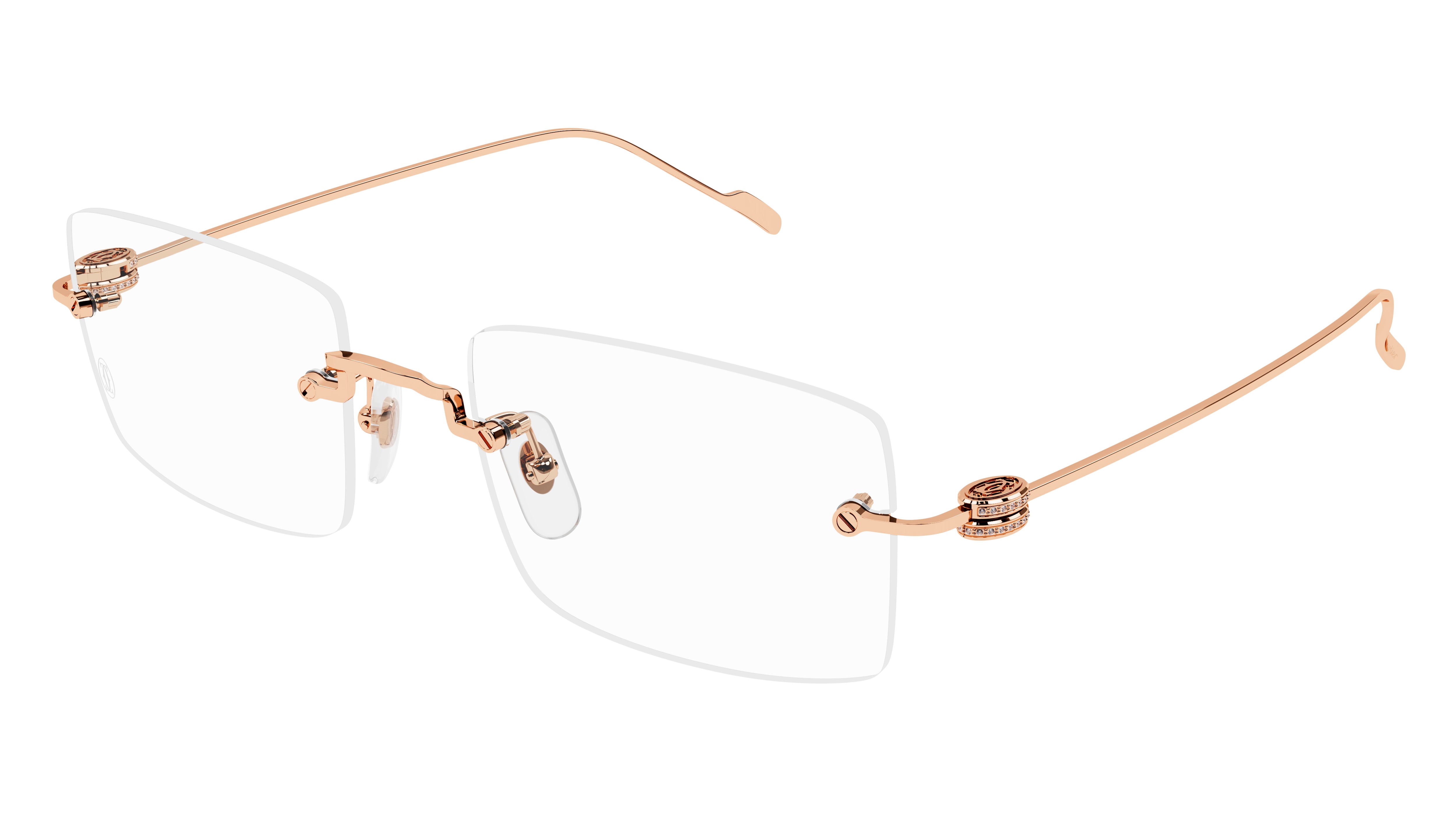 Rectangular design with a rimless front and a slim lightweight frame in white, yellow or rose 18kt gold. Enriched with the iconic Double C Décor integrated as functional and ornamental elements of the hinge and encrusted with 66 real diamonds.