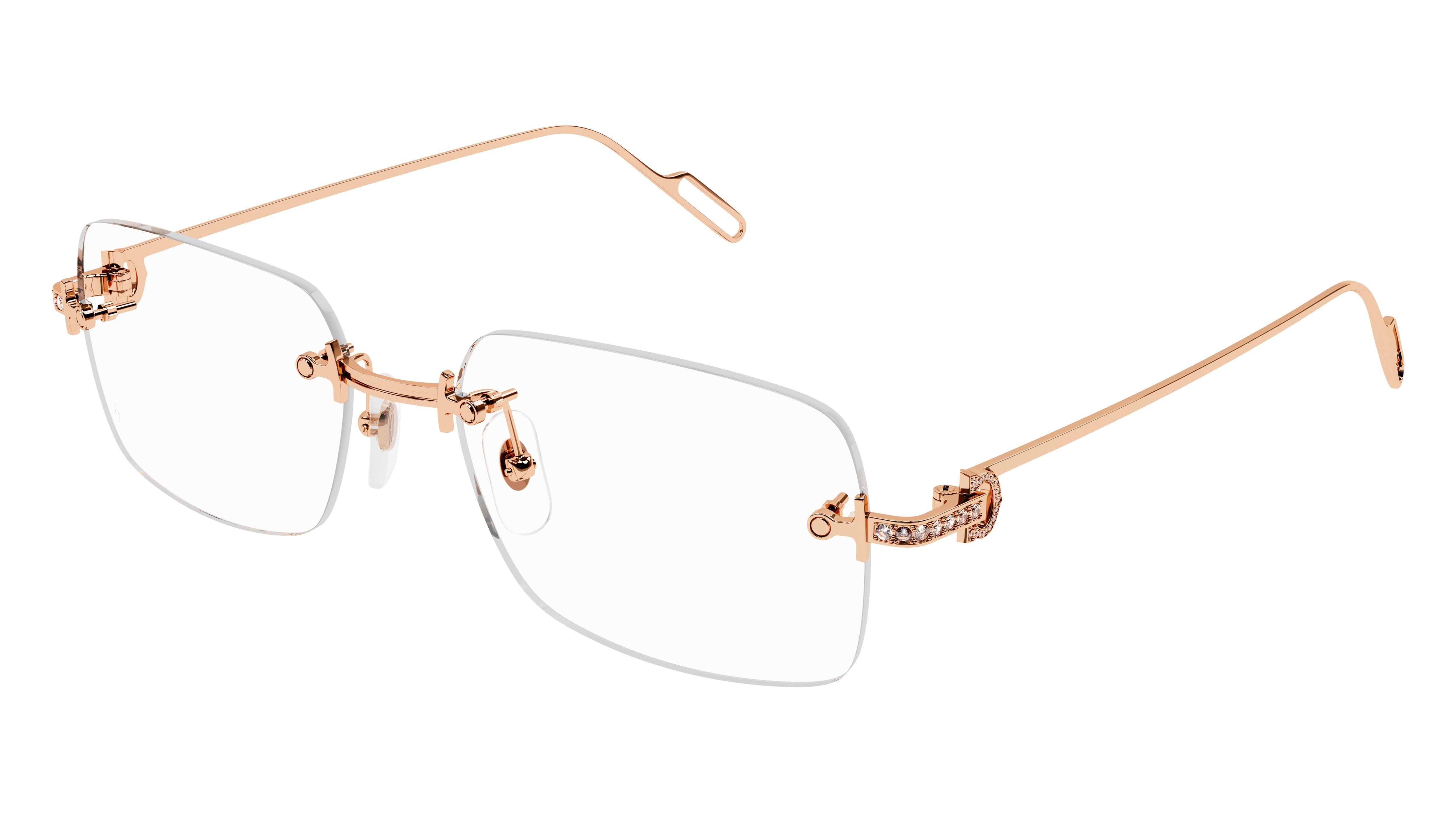 Première de Cartier style with a rimless rectangular front design and a slim lightweight frame in white, yellow or rose 18kt gold. Adorned with the C Décor and Godron motifs integrated as functional and ornamental elements of the hinge and set with 40 real diamonds.