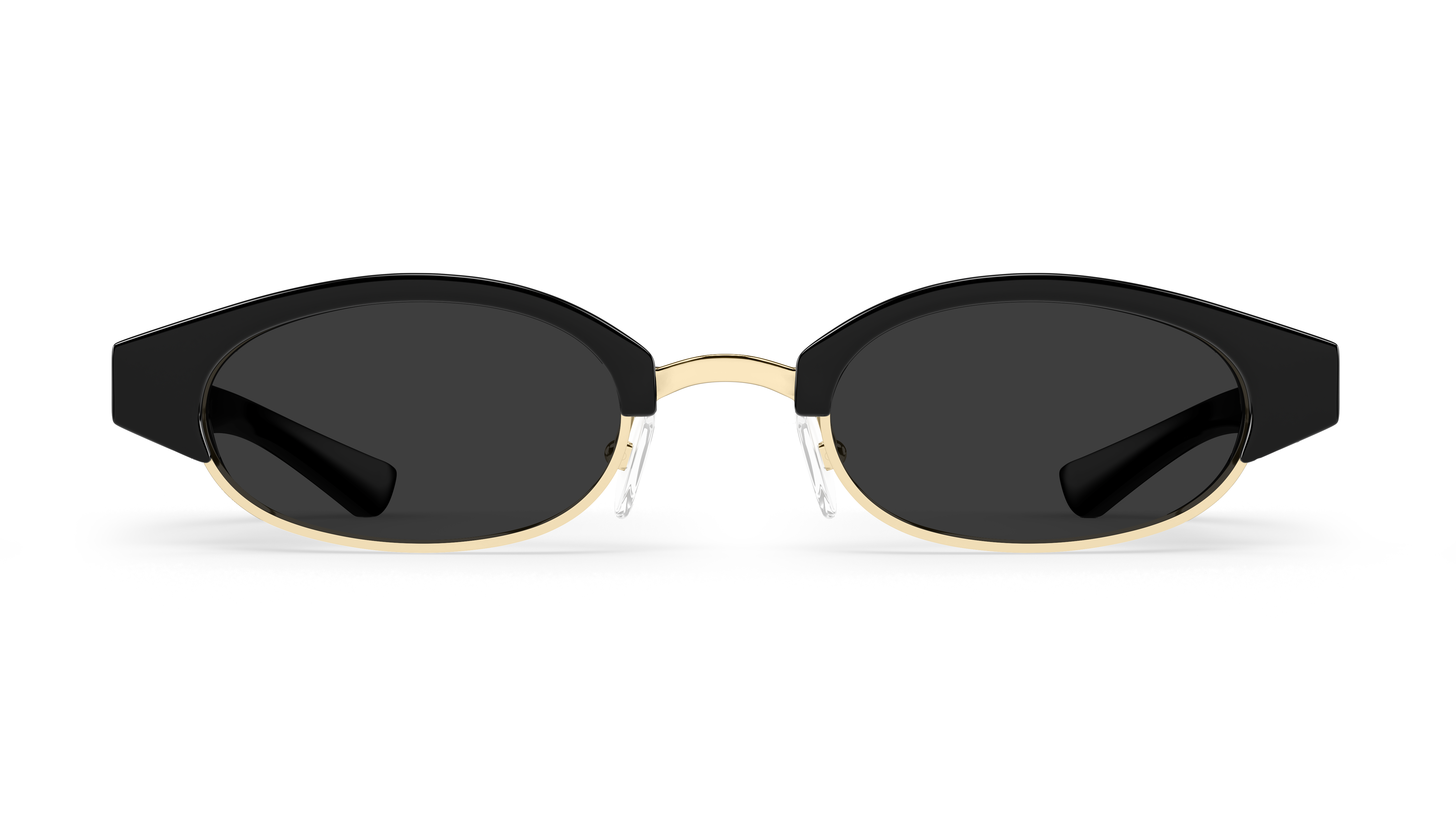 采用金属材质制作的无框太阳眼镜,纤细的金属镜腿上装饰标志性的 T-Bar